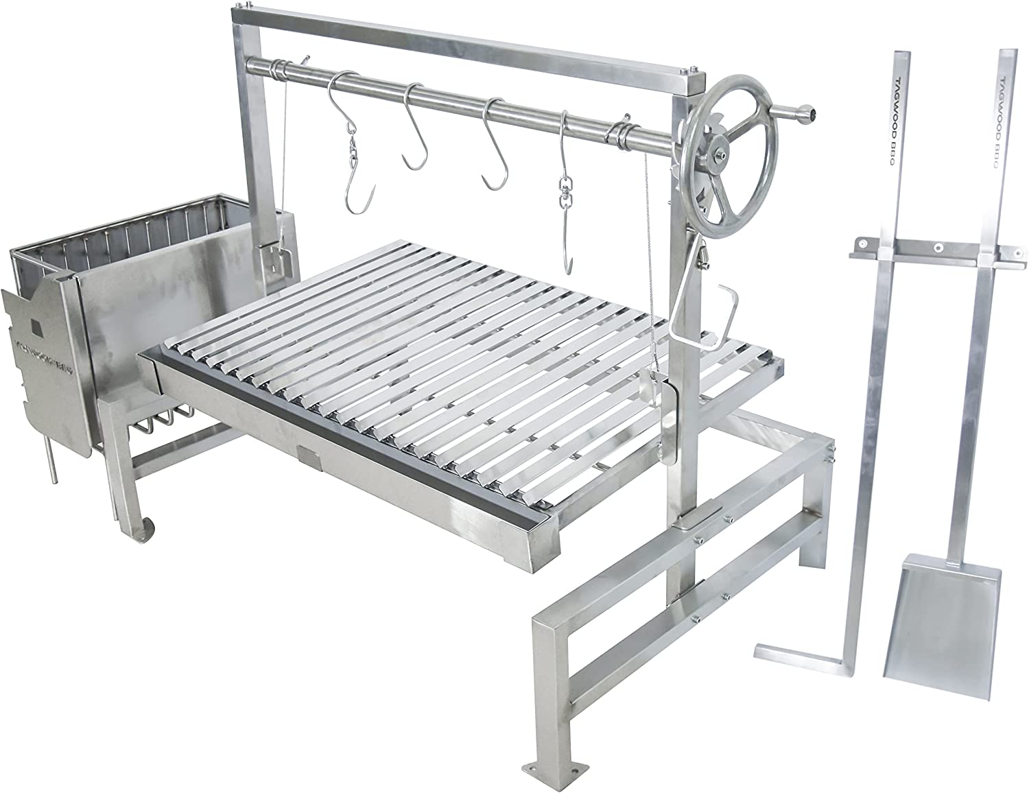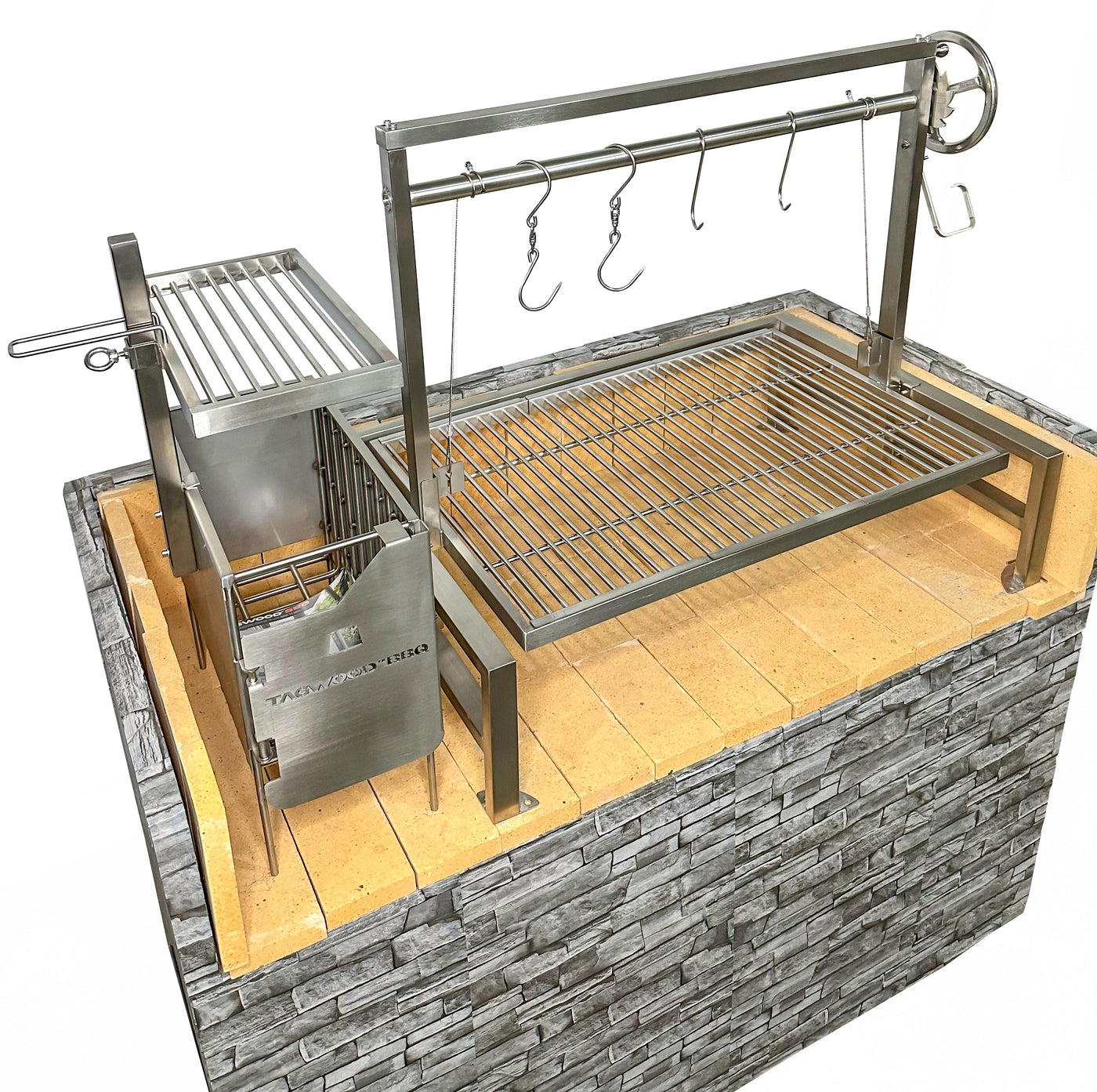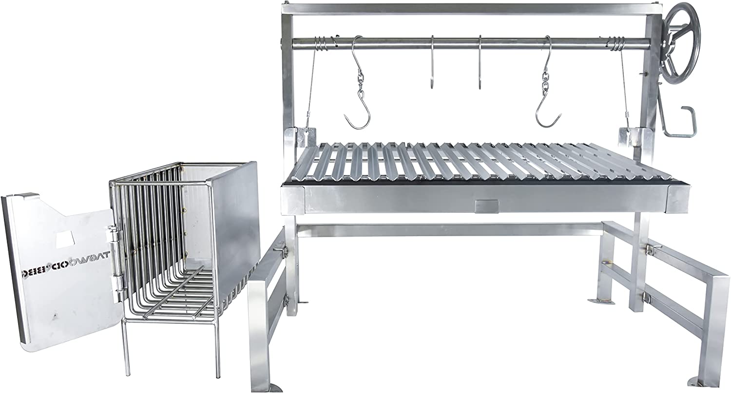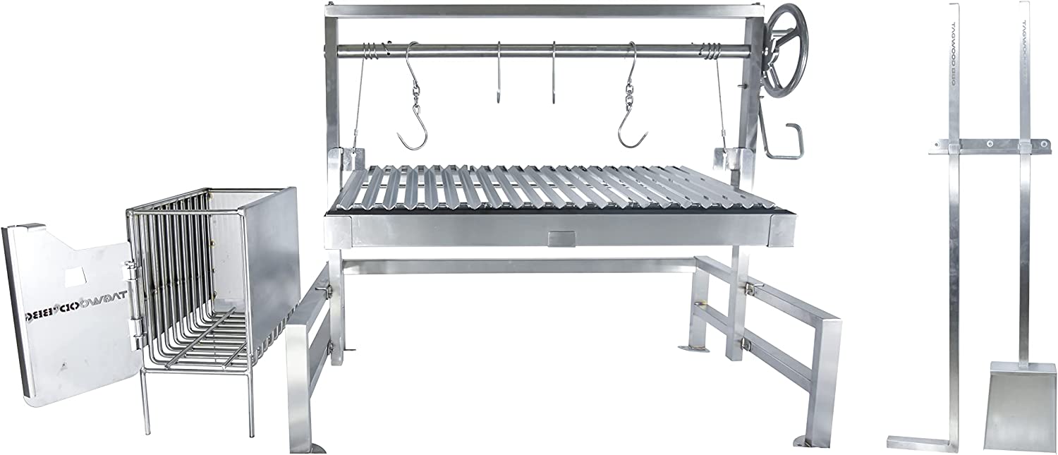 Confeccionado en acero inoxidable SS304. Area de cocción principal con altura regulable de 4.293 cm2 (81 x 53 cm.) con Rejillas en forma de V. Equipado con ladrillos refractarios, brasero, 4 ganchos S, plancha, pala y atizador.