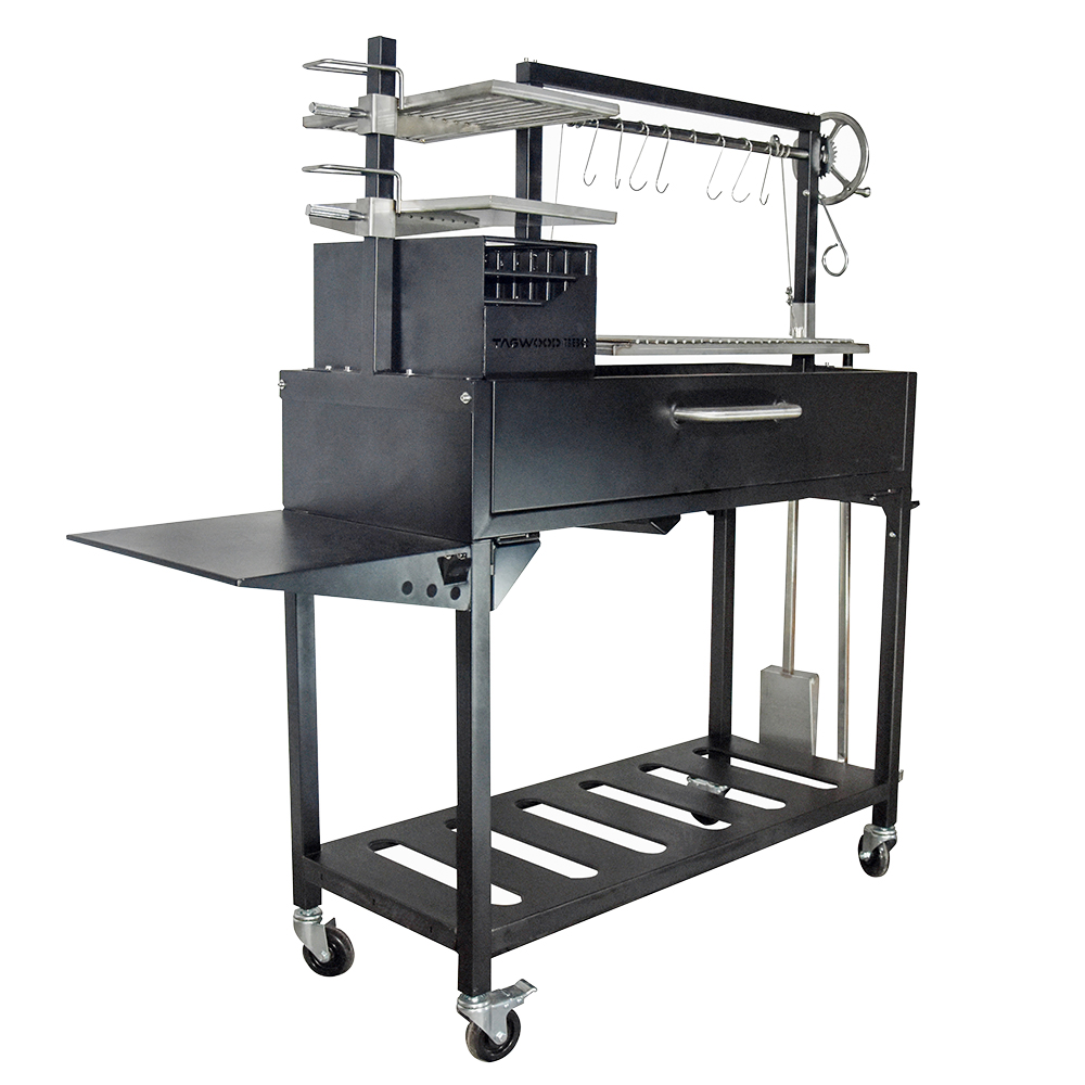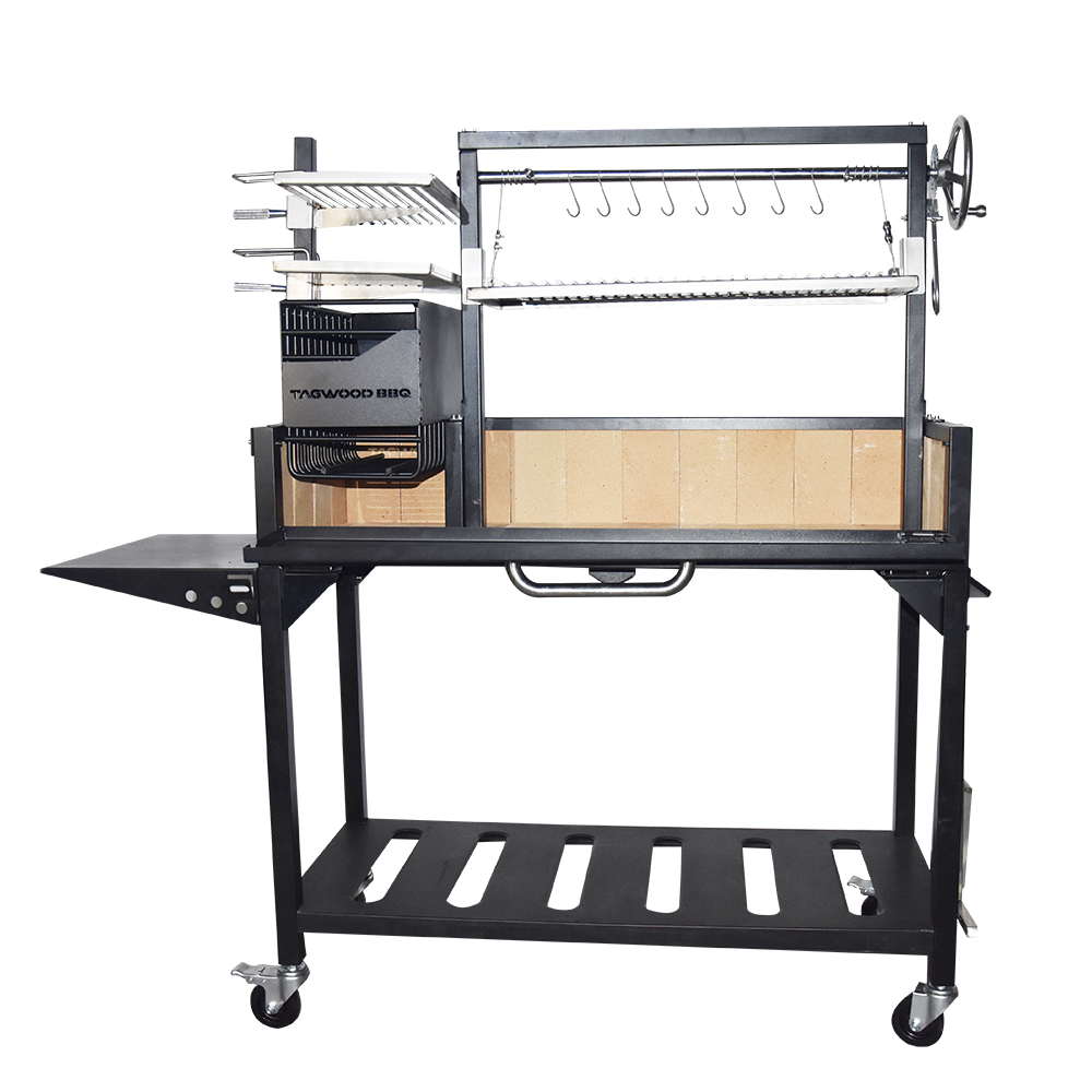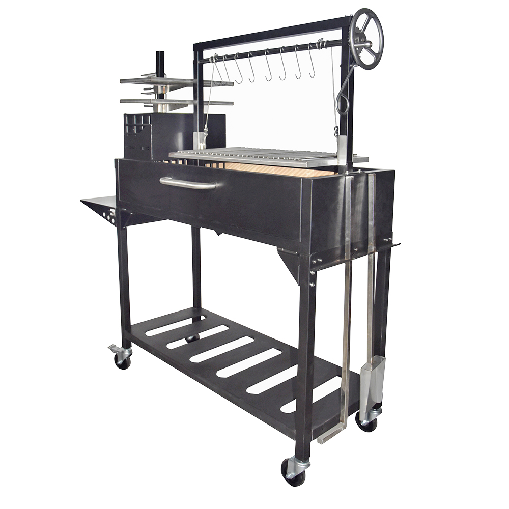 Este modelo viene equipado con brasero, 8 ganchos S, plancha ajustable en altura y una estructura interna todo confeccionado en acero inoxidable 304. Piso y paredes de ladrillos refractarios, dos ruedas giratorias con frenos, mesa lateral adjunta, puerta de acceso frontal, destapador de bebidas y una garantía limitada por 1 año. Incluye pala y atizador de acero inoxidable.