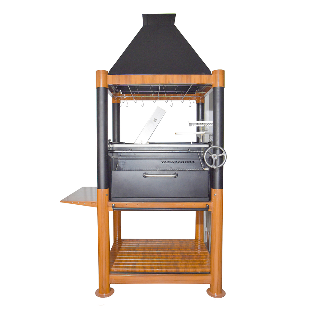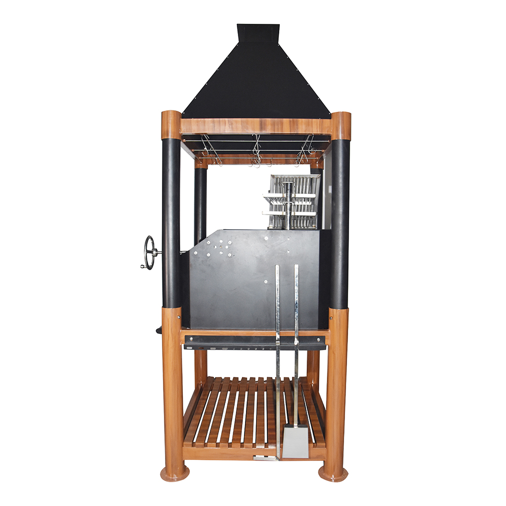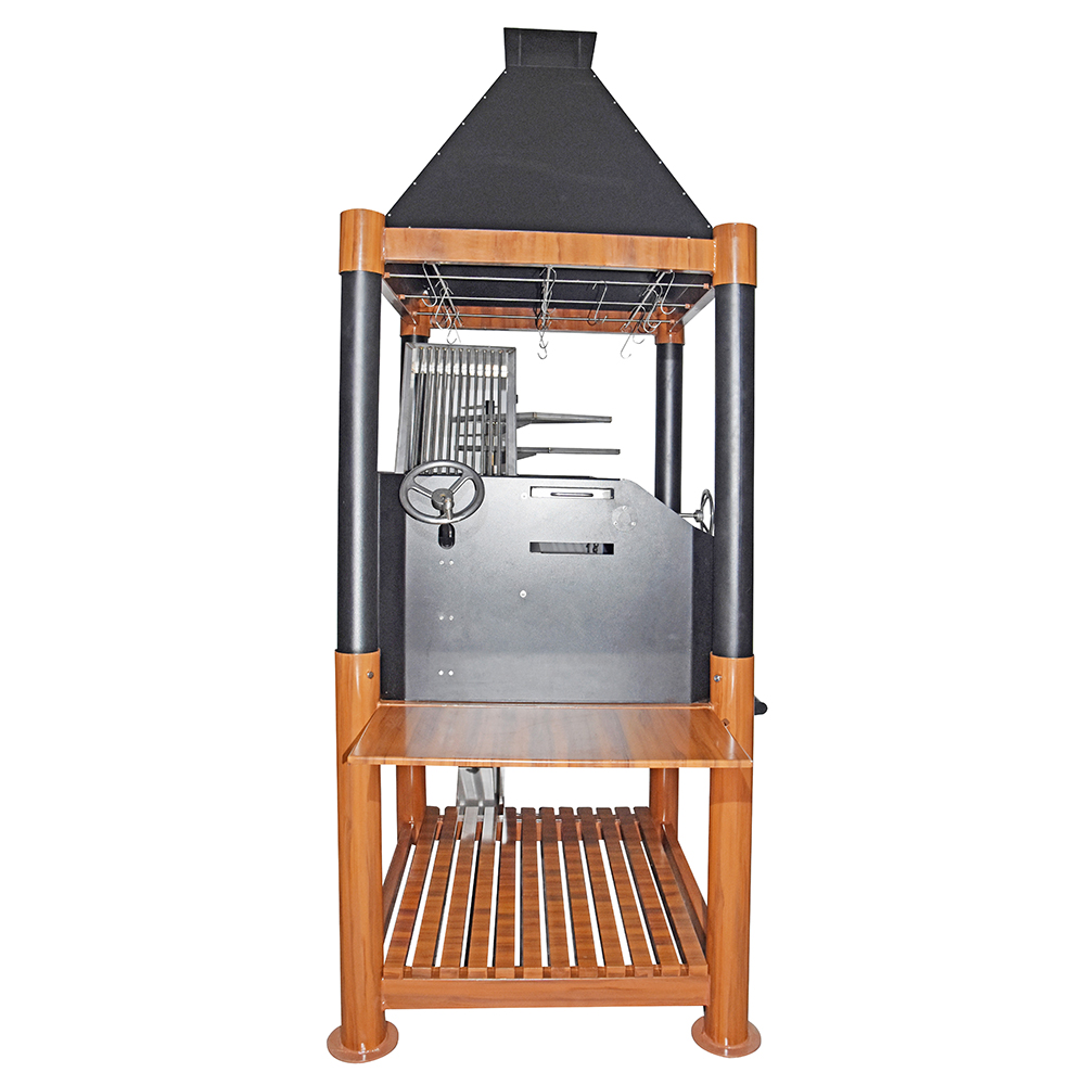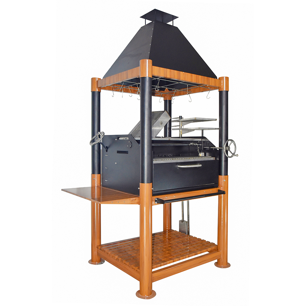 Estructura confeccionada en hierro. 6 superficies distintas de coccion de acero inoxidable. Cocción principal de altura regulable de 3.249 cm2. Equipado con ladrillos refractarios, brasero, 16 ganchos S, plancha ajustable en altura.